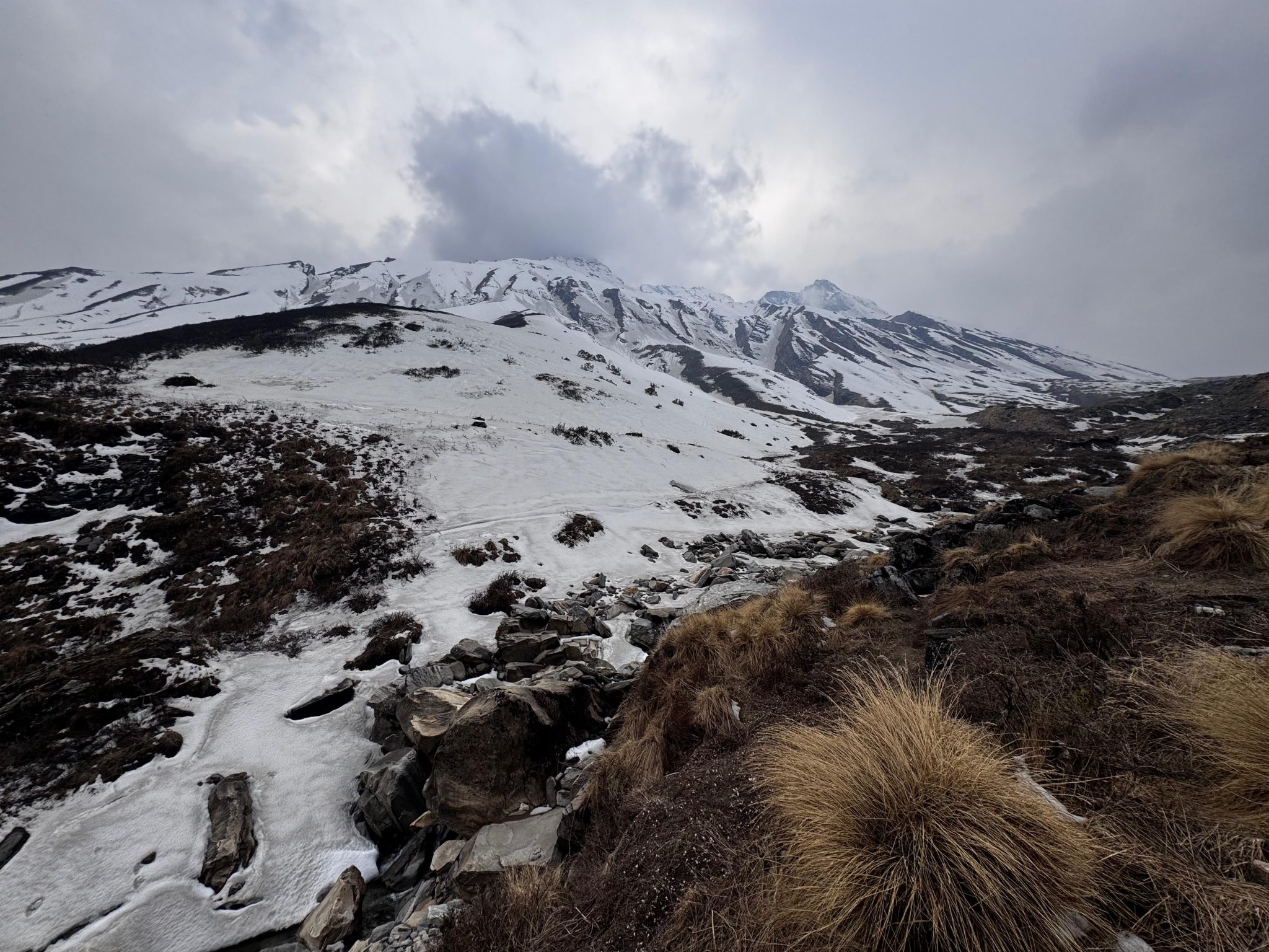 Alternative Text: A snow-covered mountainous landscape under a cloudy sky. The foreground features patches of rocky terrain and sparse brown grass, while the background showcases steep snow-capped peaks with some rocky outcrops visible.