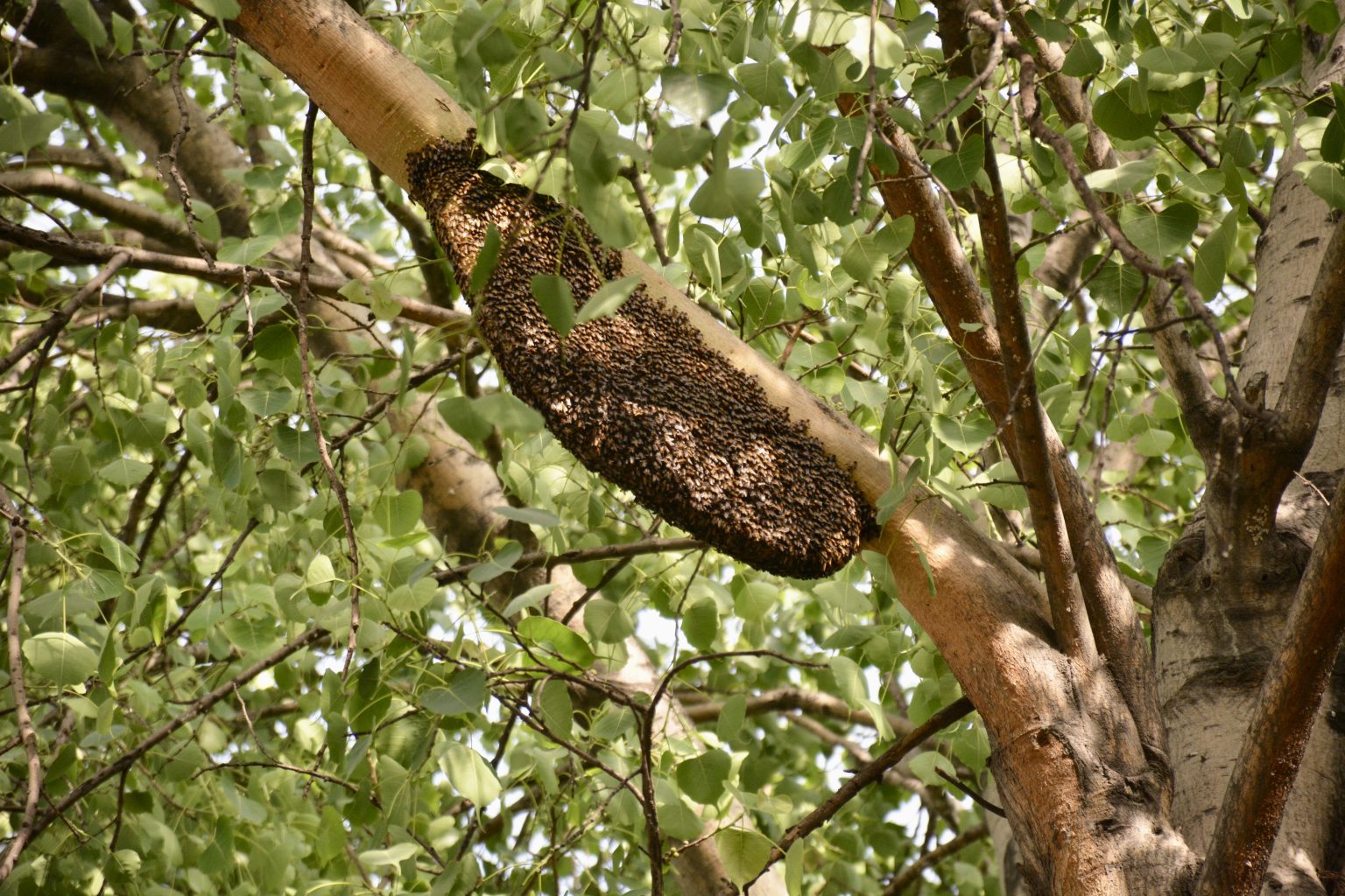 Alternative Text: A beehive hanging from the branch of a Peepal tree (Ficus religiosa), surrounded by fresh green leaves. Captured in Delhi, it shows the bees working together in their natural home.