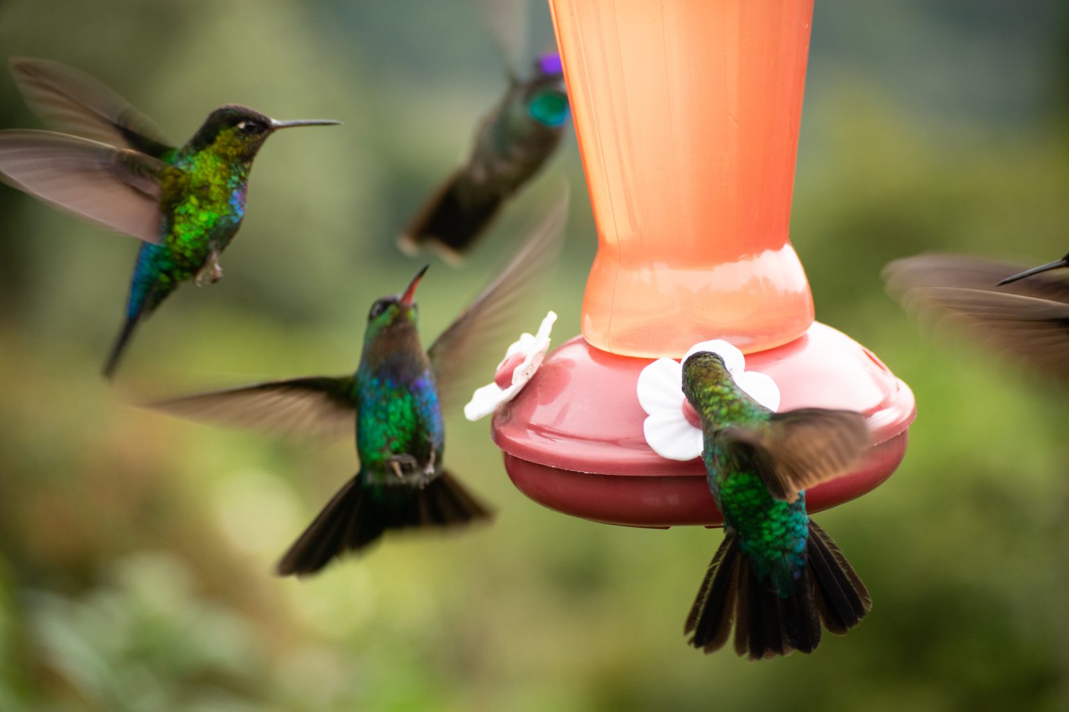 Alternative Text: Several hummingbirds with green and blue iridescent feathers are hovering and feeding around an orange and red bird feeder, with a blurred green background.