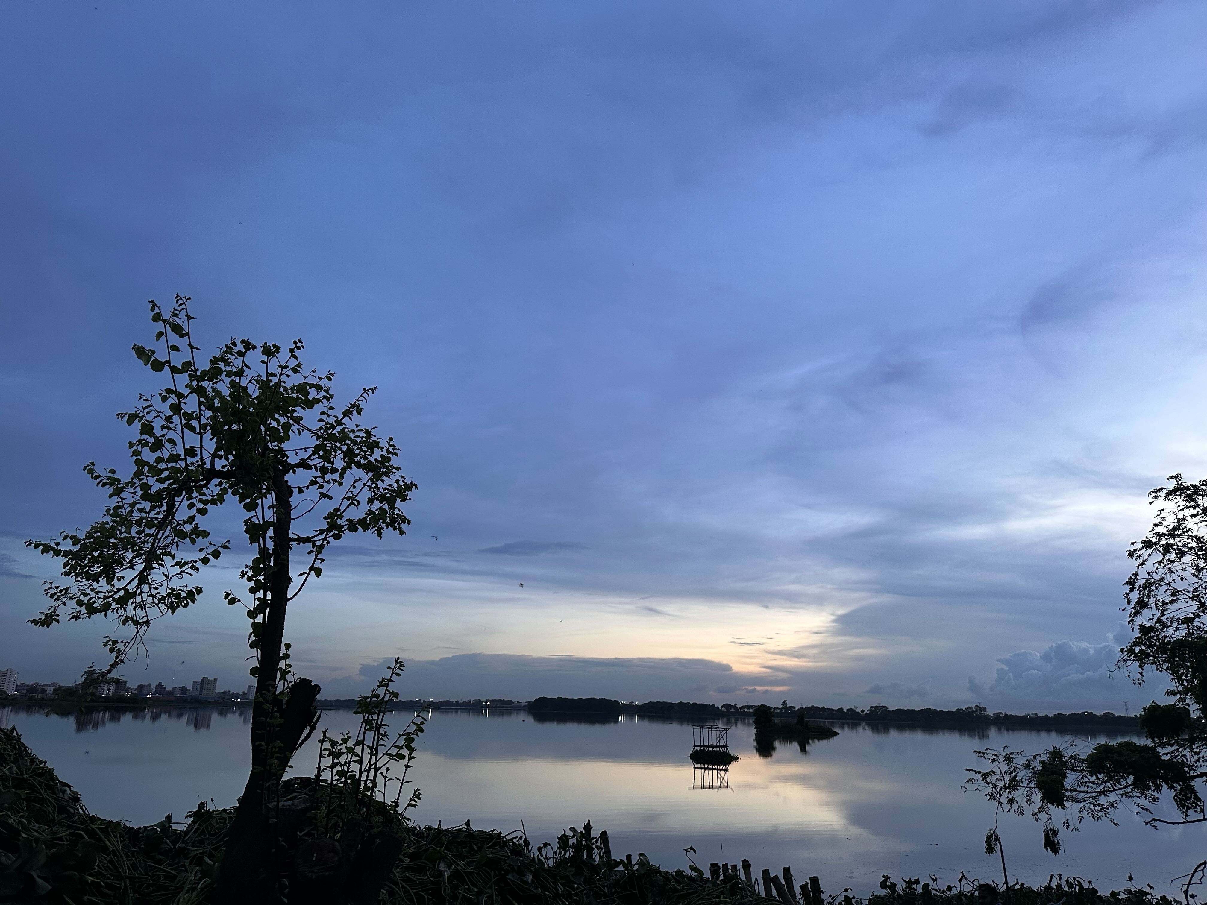 Alternative Text: A tranquil body of water reflects the soft hues of twilight, with a partially clouded sky transitioning from blue to warmer tones at the horizon.