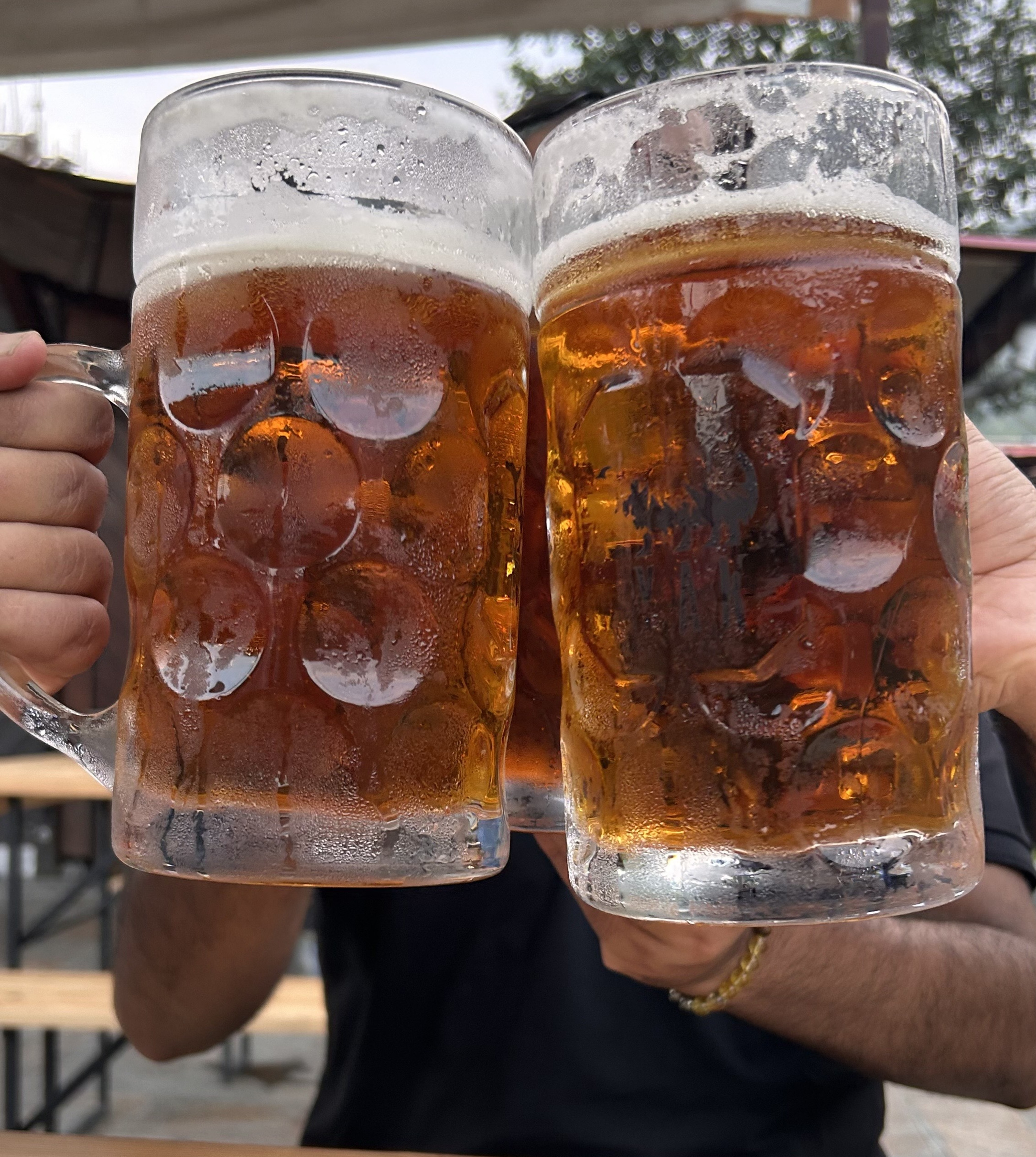 Alternative Text: Two large, frosty beer mugs are clinking together in celebration.