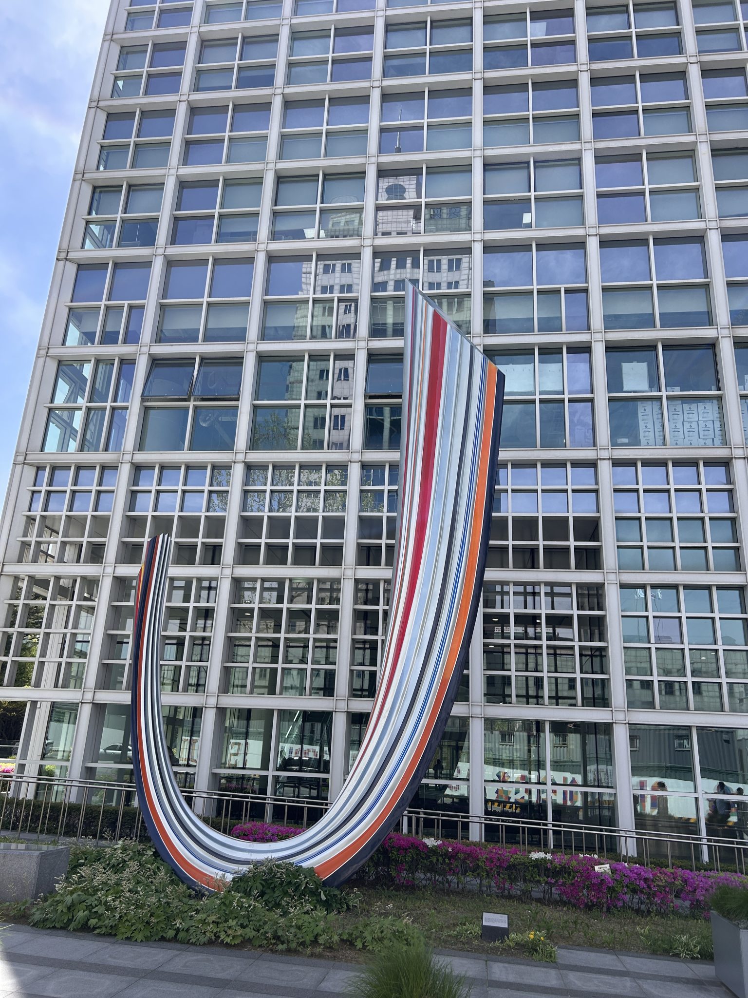 Alternative Text: A colorful, curved sculpture with stripes in red, blue, orange, and white is positioned in front of a modern glass building.