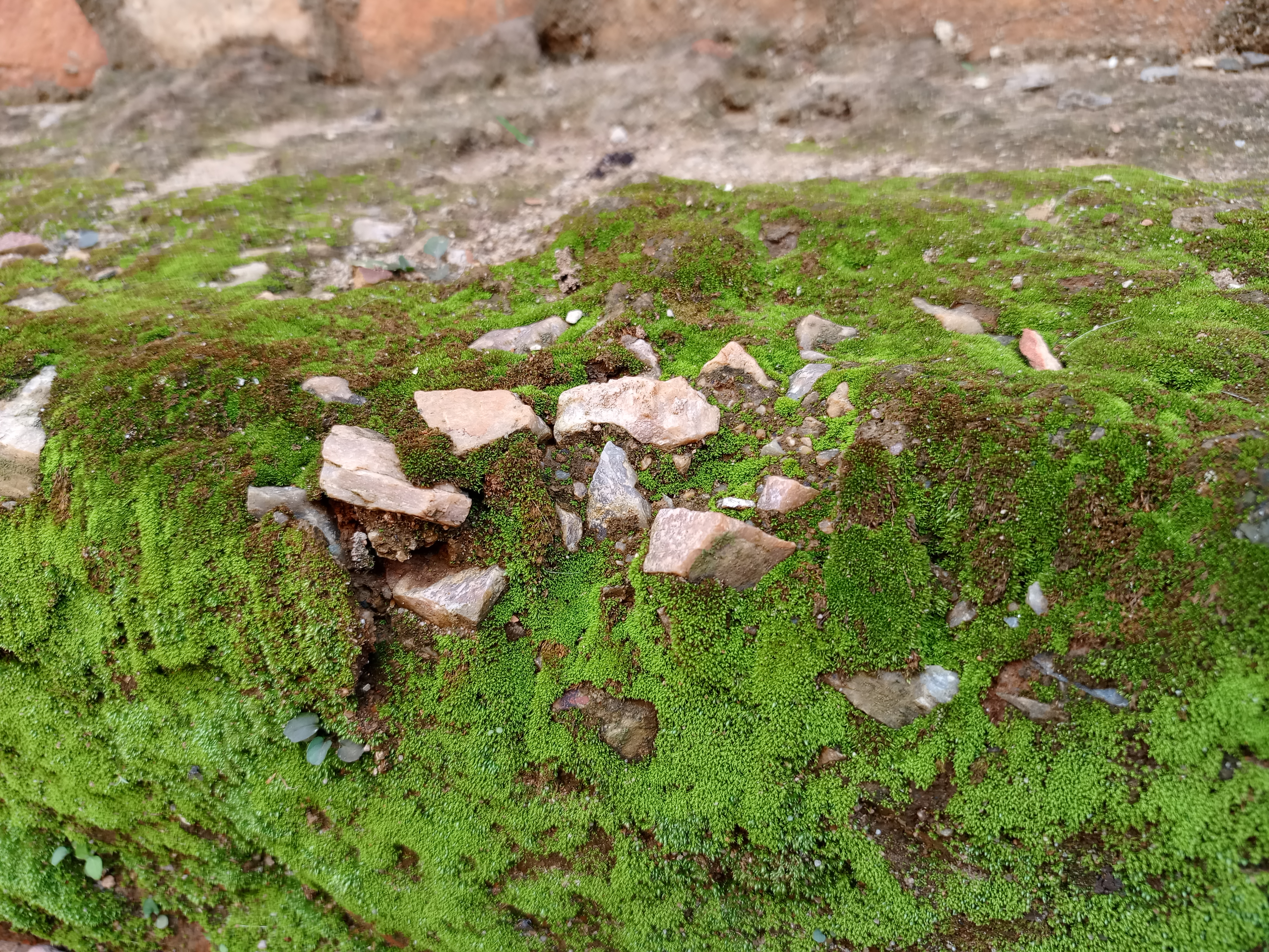 Alternative Text: A close-up, high-angle view of green moss growing on an old brick and concrete ledge, with small pebbles scattered throughout.