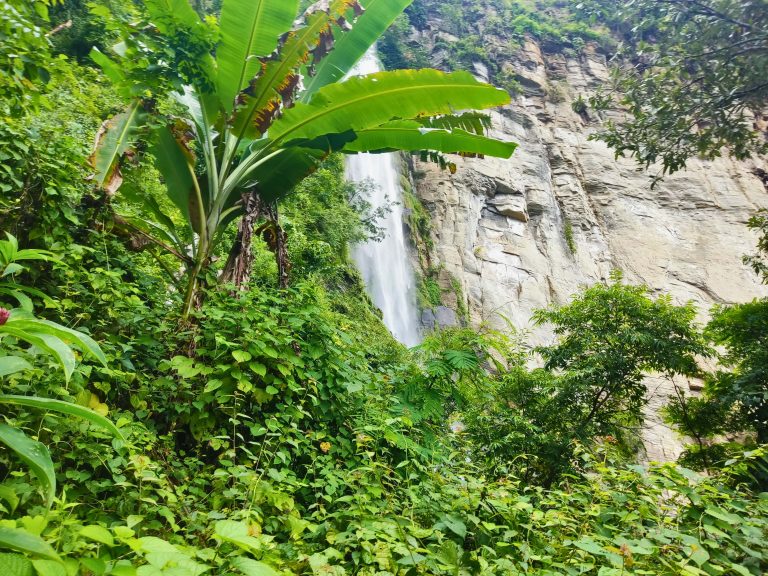 Alternative Text: A lush green landscape featuring a waterfall cascading down a rocky cliff. Abundant tropical foliage, including large banana leaves and various green plants, surrounds the scene, creating a vibrant and natural atmosphere.