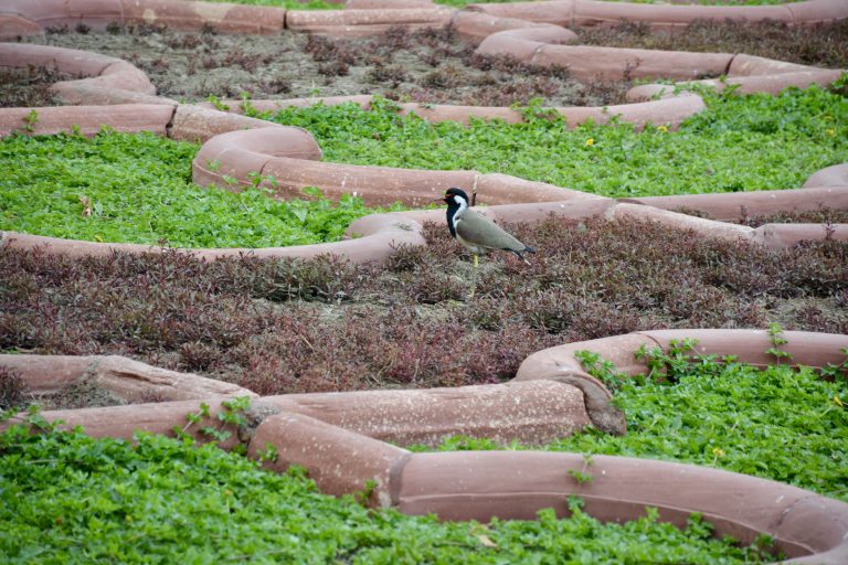 Alternative Text: A Red-wattled Lapwing (Vanellus indicus) stands among patterned garden beds bordered by red sandstone. Captured at Agra Fort, Uttar Pradesh, India.