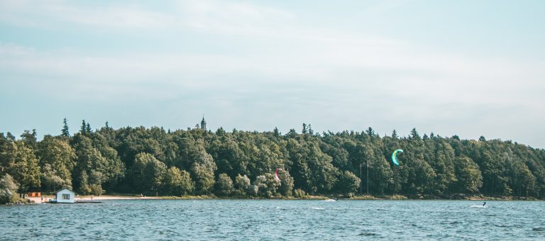 Alternative Text: View of a forested shoreline in Lithuania with a small white beach house and people by the water. Kite surfers with colorful kites are gliding across the lake under a bright summer sky, with a church tower visible above the treeline in the distance.