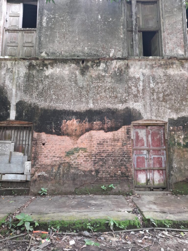 Alternative Text: An old building with peeling paint, rustic doors, and overgrown moss.