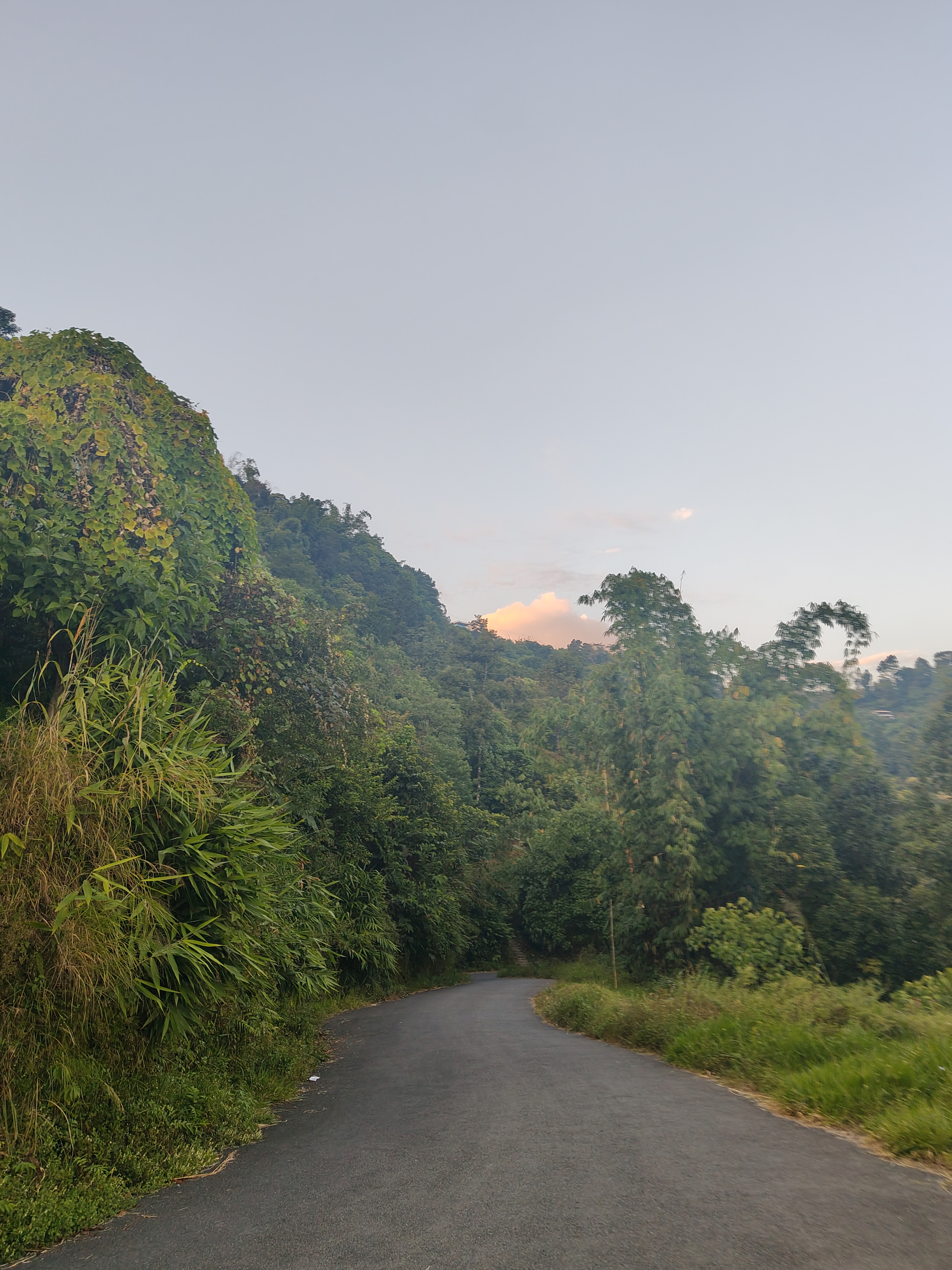 Alternative Text: A winding road leads through a lush green landscape, flanked by dense foliage and trees.