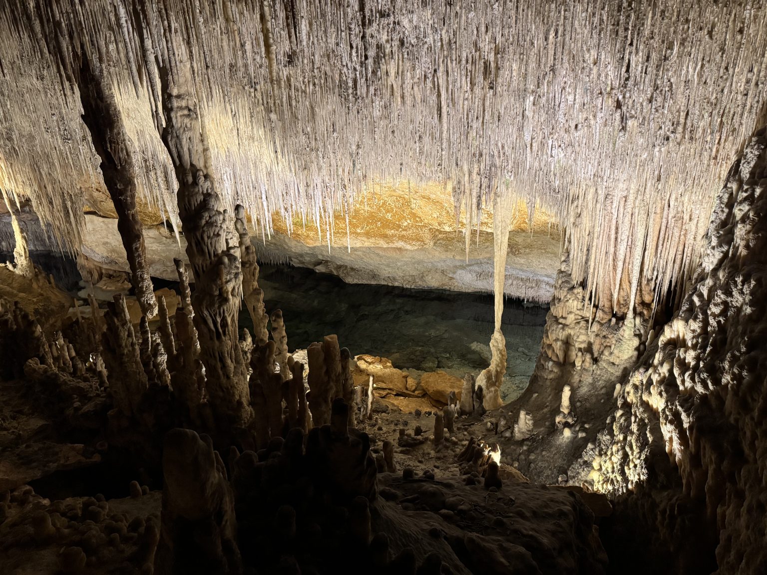 Alternative Text: The Cave of Drach features limestone filled with dramatic rock formations. Long, thin stalactites hang densely from the ceiling like icicles while thick stalagmites rise from the cave floor below. Warm lighting highlights the texture and colour of the rocks.