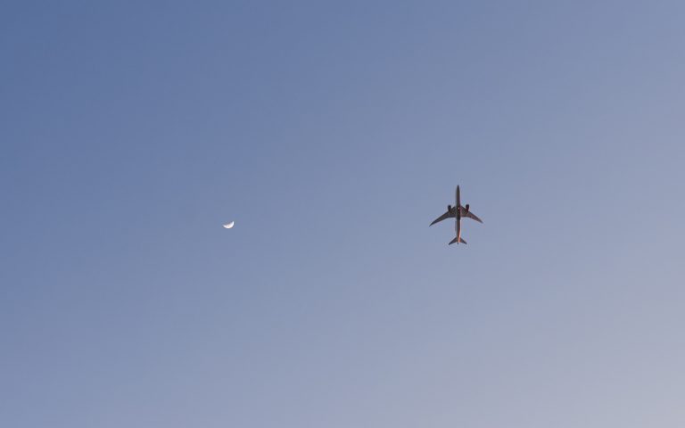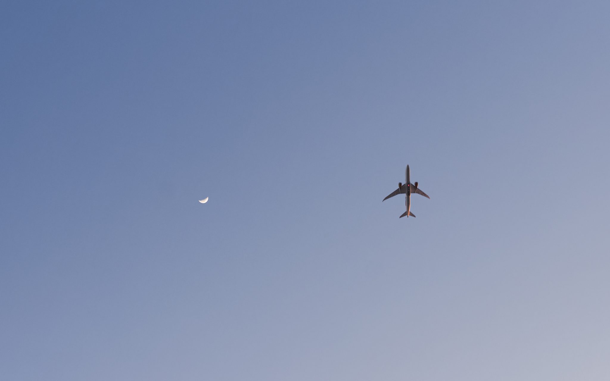 Alternative Text: A commercial airplane, viewed from below, flies across a clear blue daytime sky near a thin crescent moon.