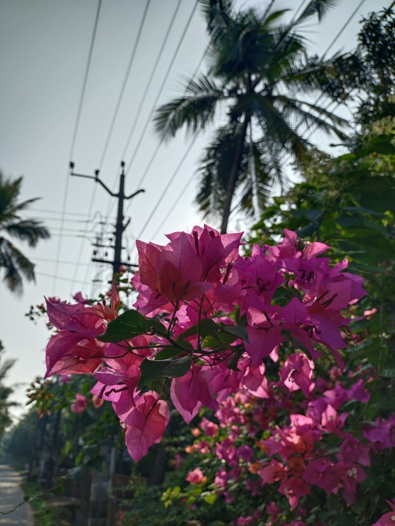 Alternative Text: Vibrant pink bougainvillea blossoms against a backdrop of palm trees and power lines.