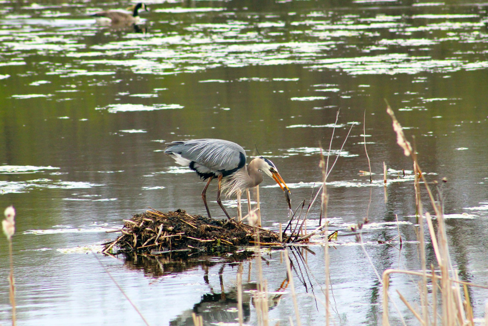 Alternative Text: Great Blue Heron catching a fish at Montezuma Wildlife Refuge, Seneca Falls, New York, USA