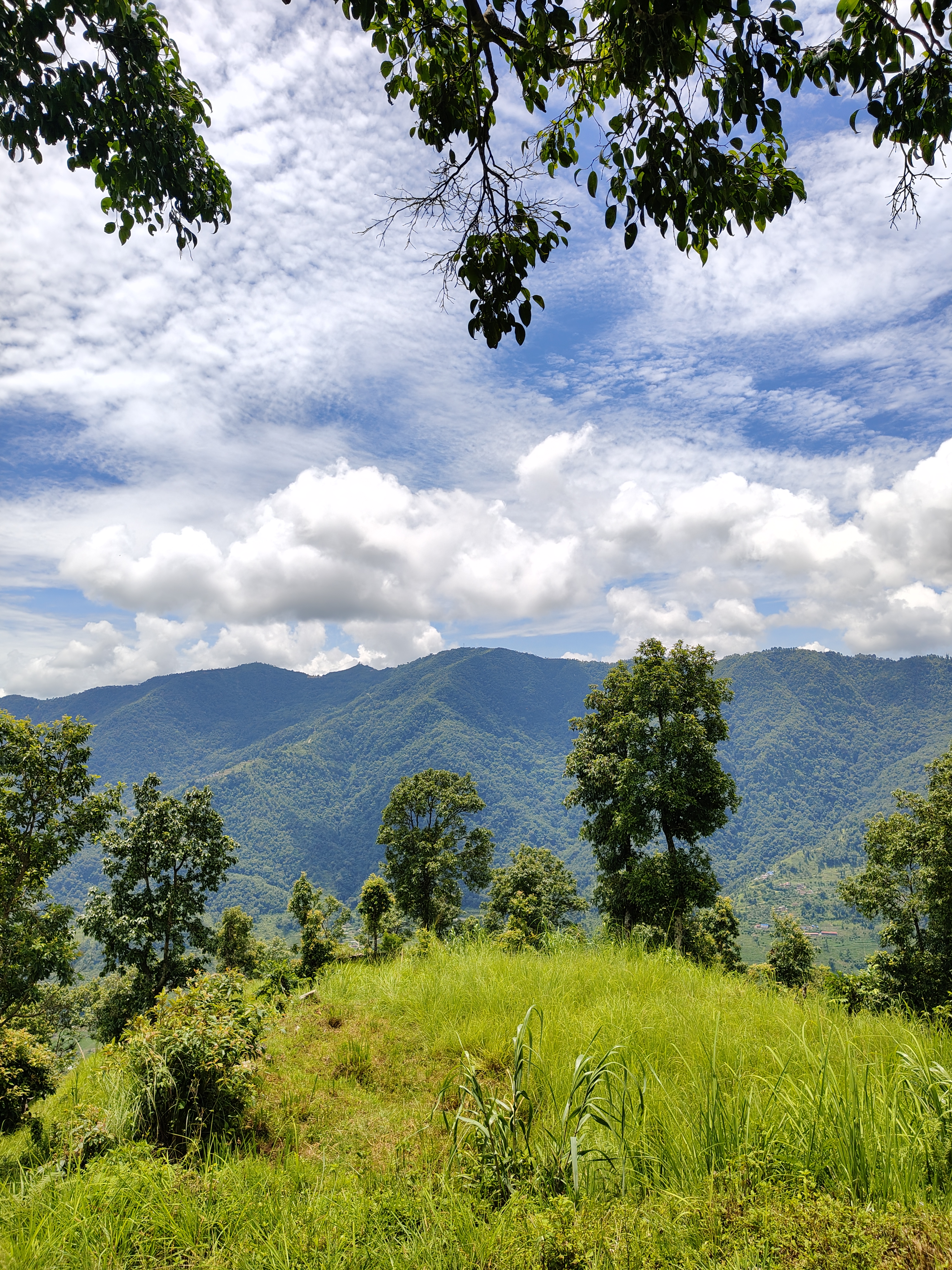 Alternative Text: A panoramic view of lush green mountains under a vibrant blue sky dotted with fluffy white clouds.