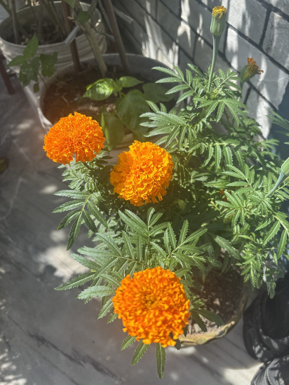 Alternative Text: A close-up view of a marigold plant with vibrant orange flowers blooming.