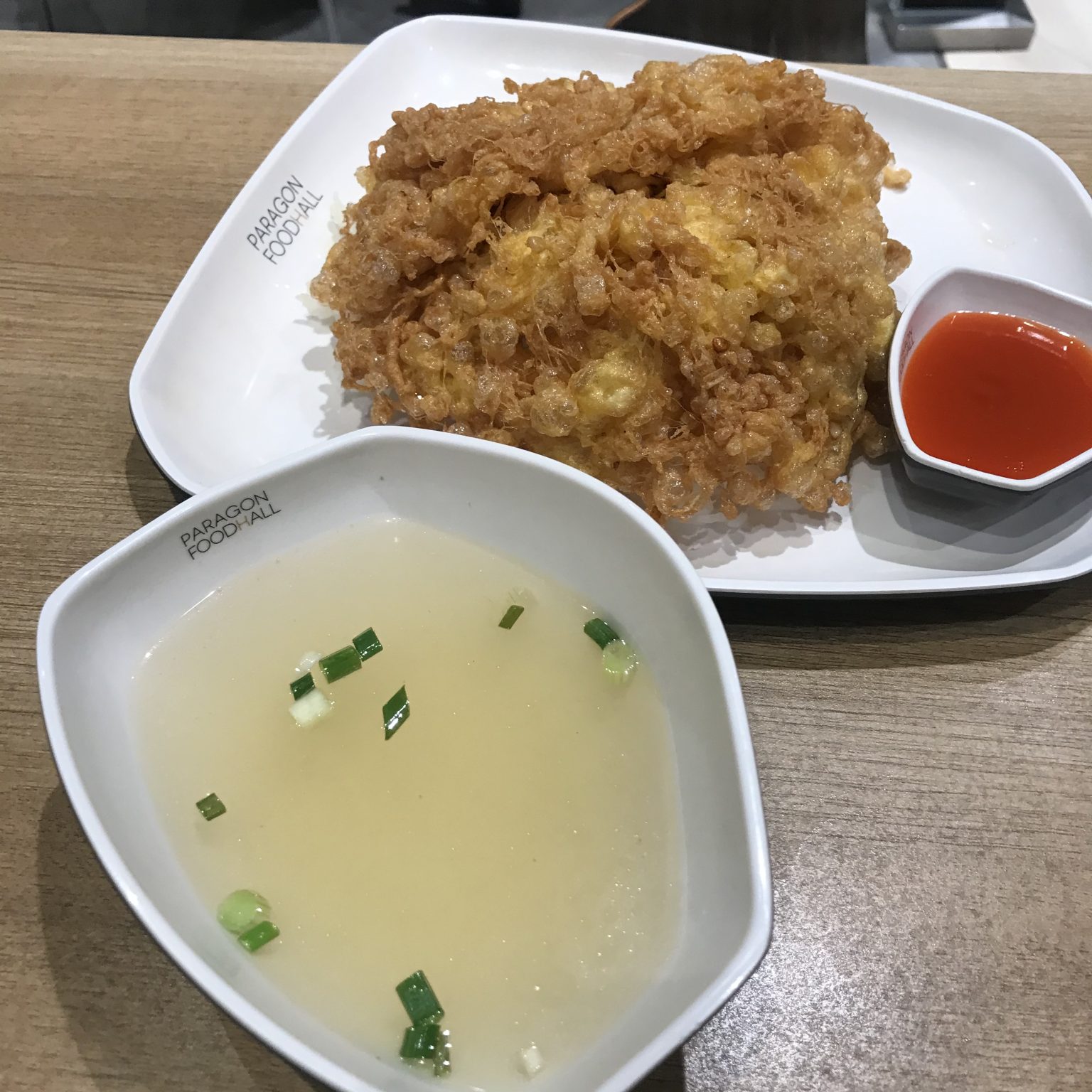 Alternative Text: A large, crispy fried Chicken, served on a white plate with a side of red chili sauce. A separate bowl of clear soup with chopped green onions is also on the table