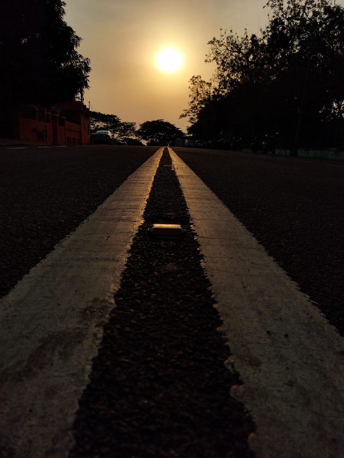 Alternative Text: Looking down the stripes in the center of a road as the sun sets in the distance.