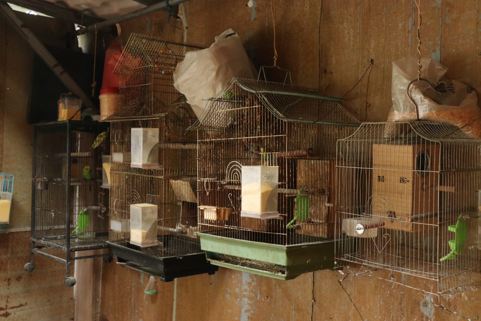Alternative Text: This photograph shows a row of four metal wire birdcages of various sizes hanging against a rustic, distressed brown wooden wall. The setup is an enclosure for keeping several small birds, such as budgerigars and similar species.
