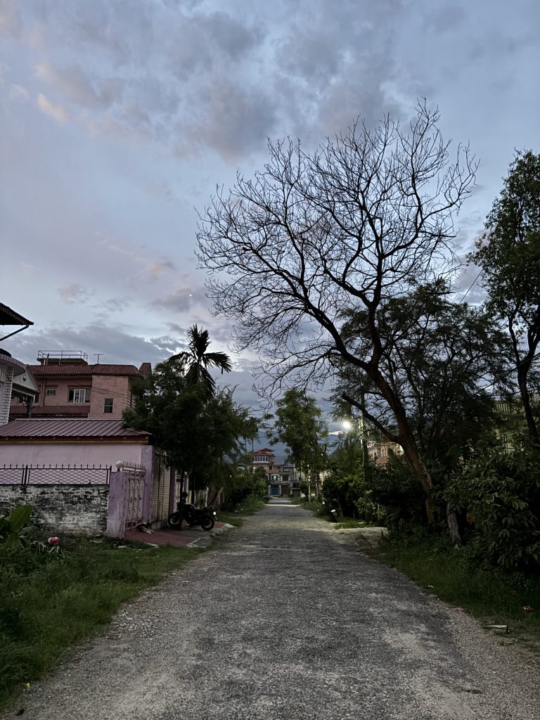 Alternative Text: A quiet residential street at dusk, lined with trees and houses. On the left, a pink house with a red roof and a motorbike parked near the gate. On the right, a tall bare tree with twisting branches stands against a blue-gray evening sky scattered with clouds. Streetlights glow faintly in the distance, illuminating the pathway that stretches straight ahead.