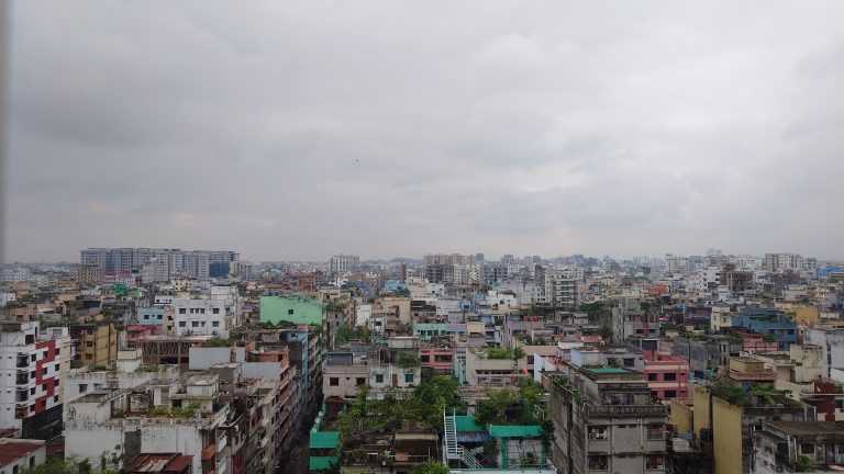 Alternative Text: A panoramic view of the city skyline from a high-rise building, showcasing tall buildings and the urban landscape of Mohammadpur, Dhaka, Bangladesh.