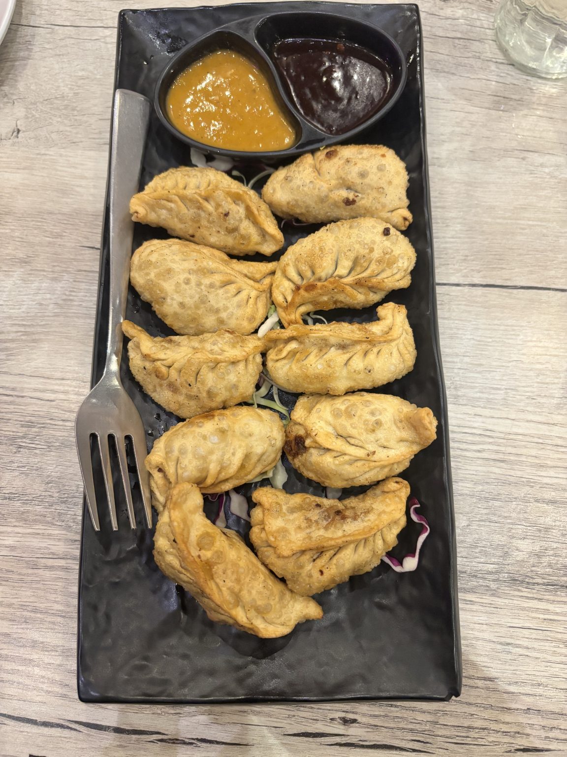 Alternative Text: A black rectangular plate holds a serving of golden-brown fried dumplings arranged neatly