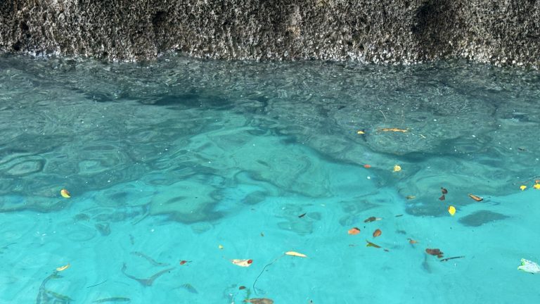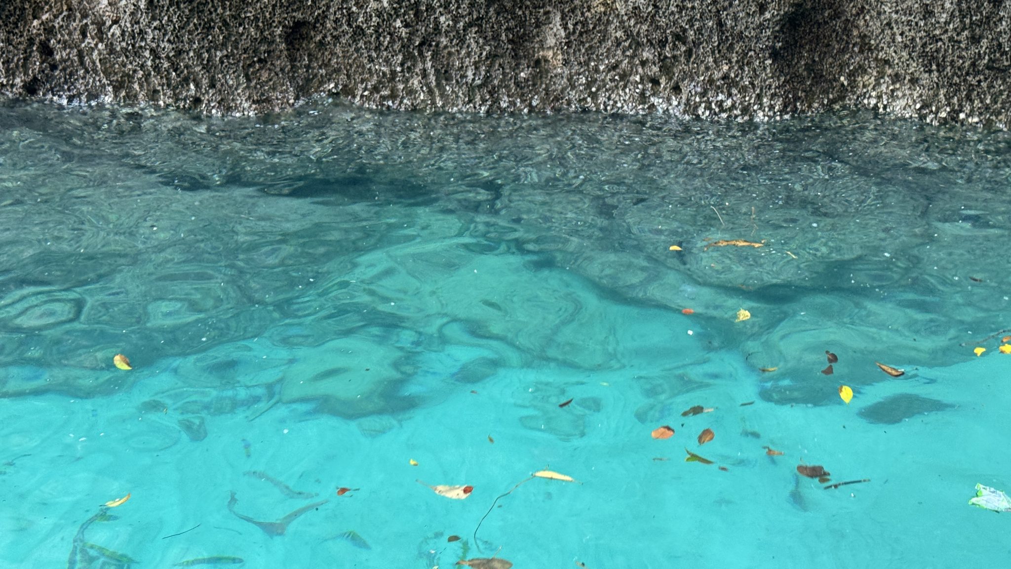 Alternative Text: Top view of clear blue sea water with floating leaves and a rocky cliff edge visible above.