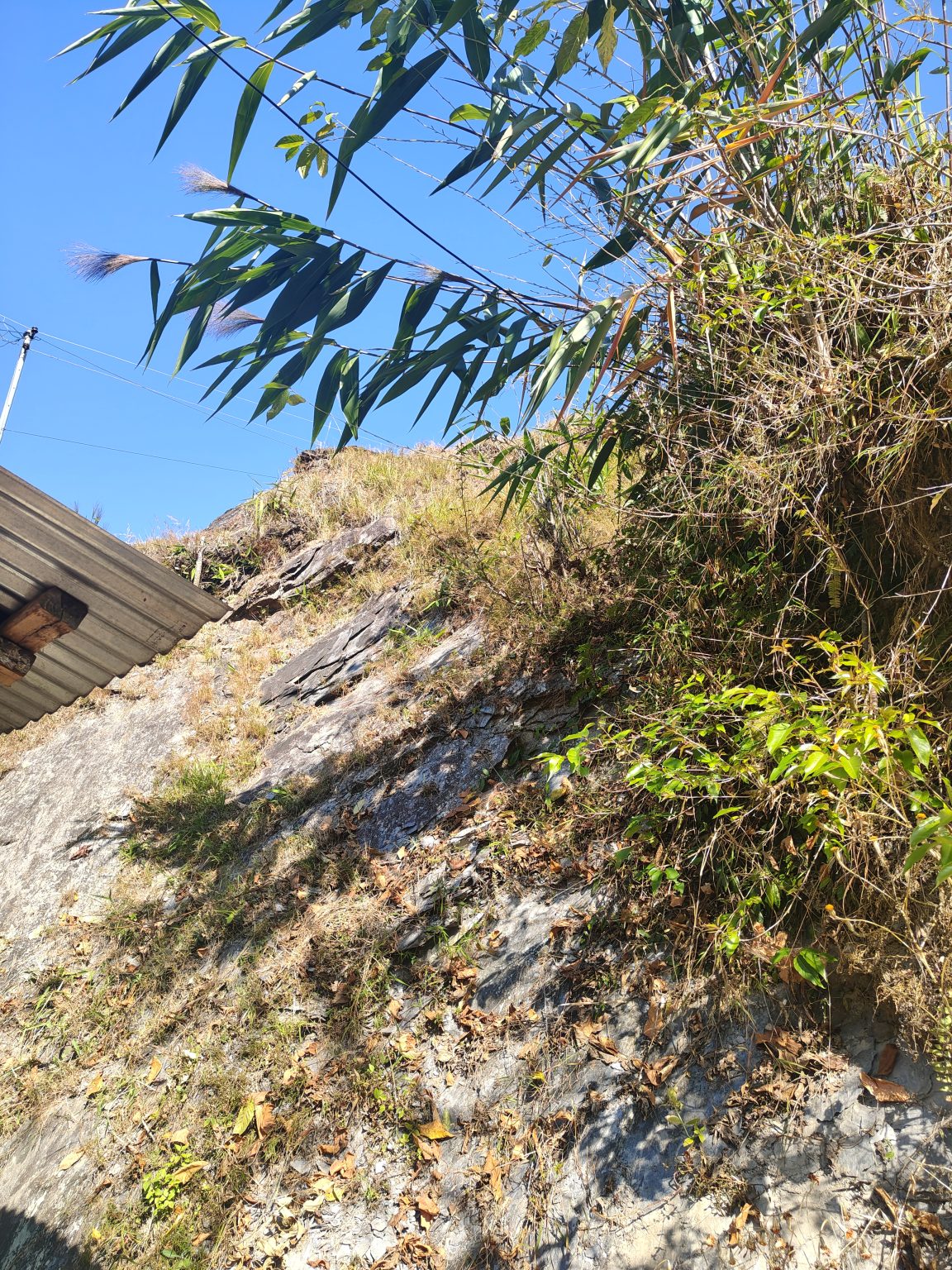 Alternative Text: A rocky hillside is partially covered with dry grass and scattered leaves. In the foreground, green plants with leaves are visible, and some tall grasses with feathery flower tops can be seen above.