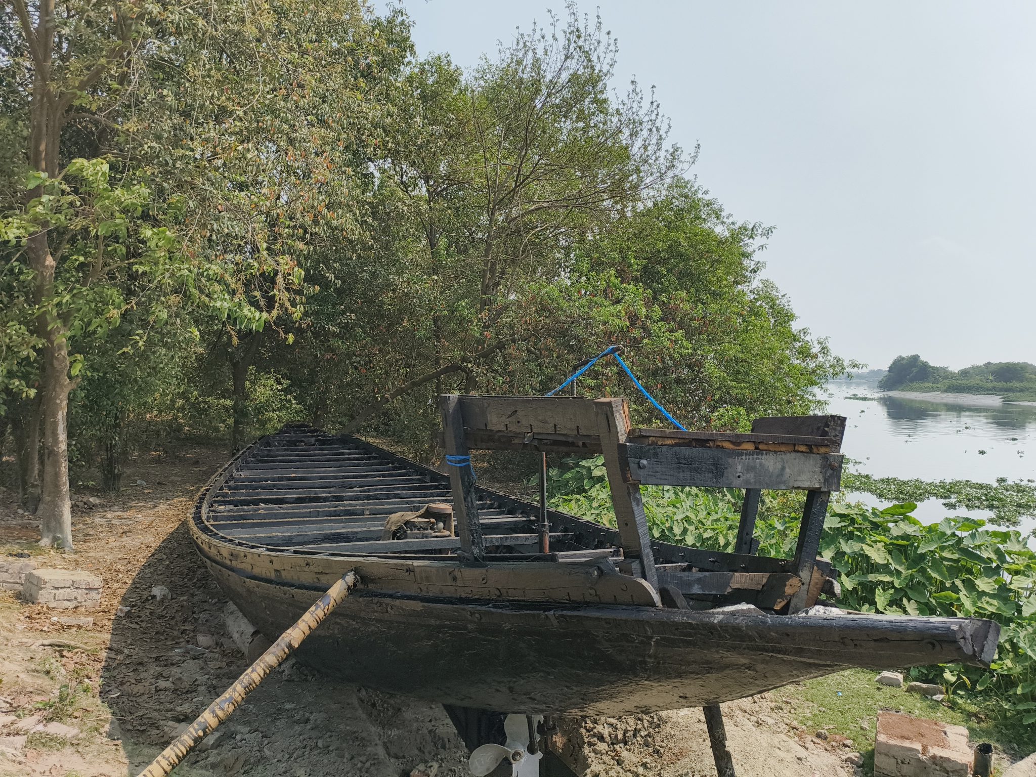 Alternative Text: A wooden boat resting on the shore beside a lush green riverbank.