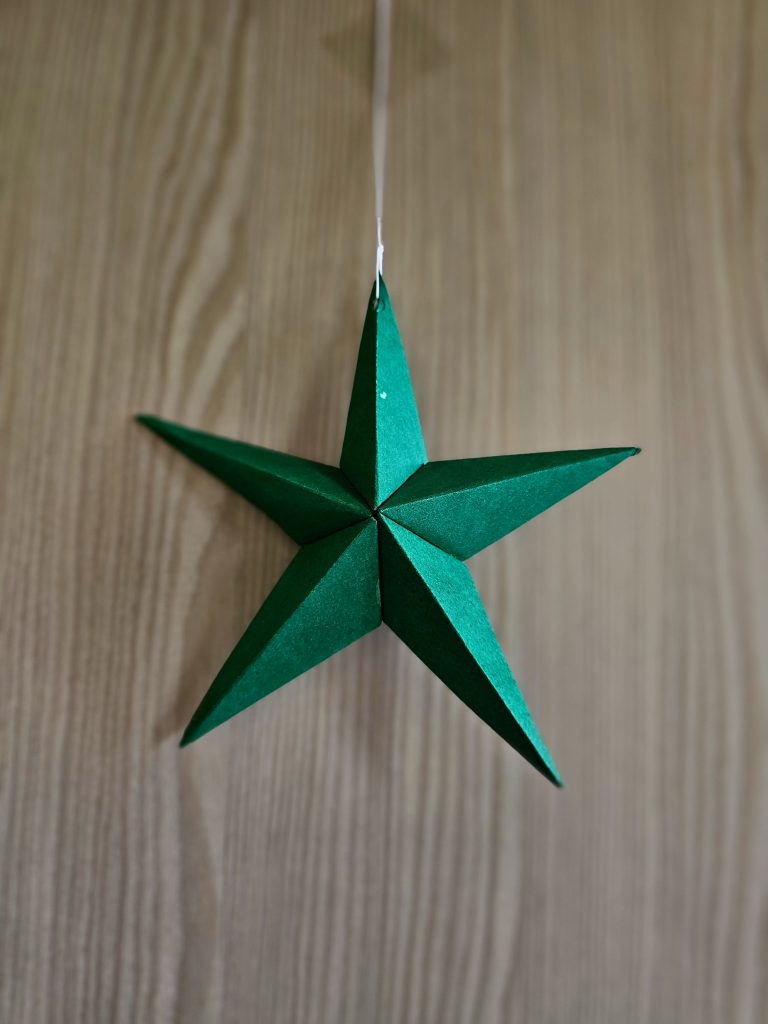 Alternative Text: A green paper star decoration suspended on a thread, photographed against a wooden surface. The neat folds and rich colour reflect simple festive creativity. This minimal Christmas decoration was captured in Kozhikode, Kerala.