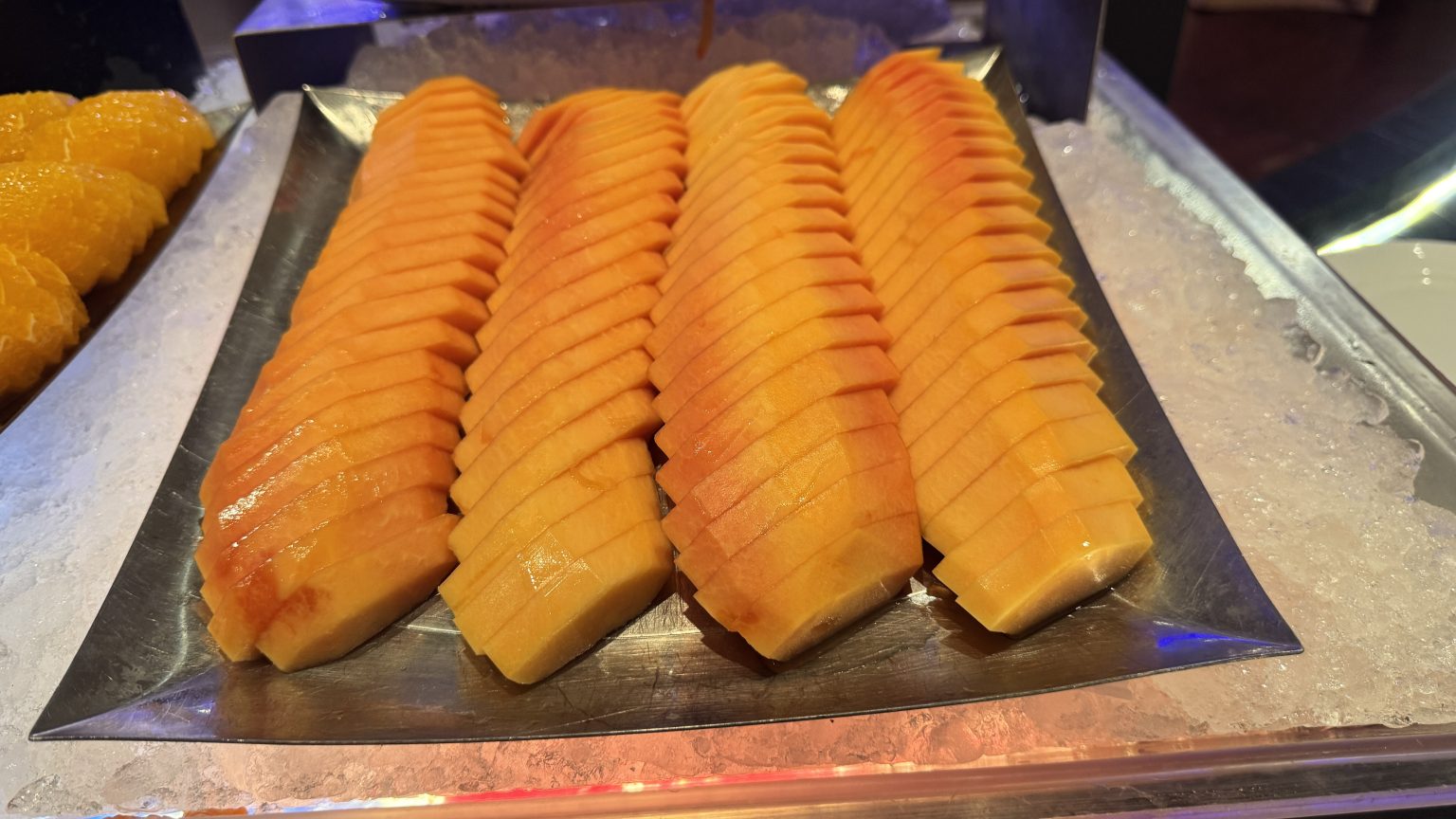 Alternative Text: A tray of neatly arranged sliced mangoes, showcasing their bright orange flesh and shiny surface, sits on a bed of ice.