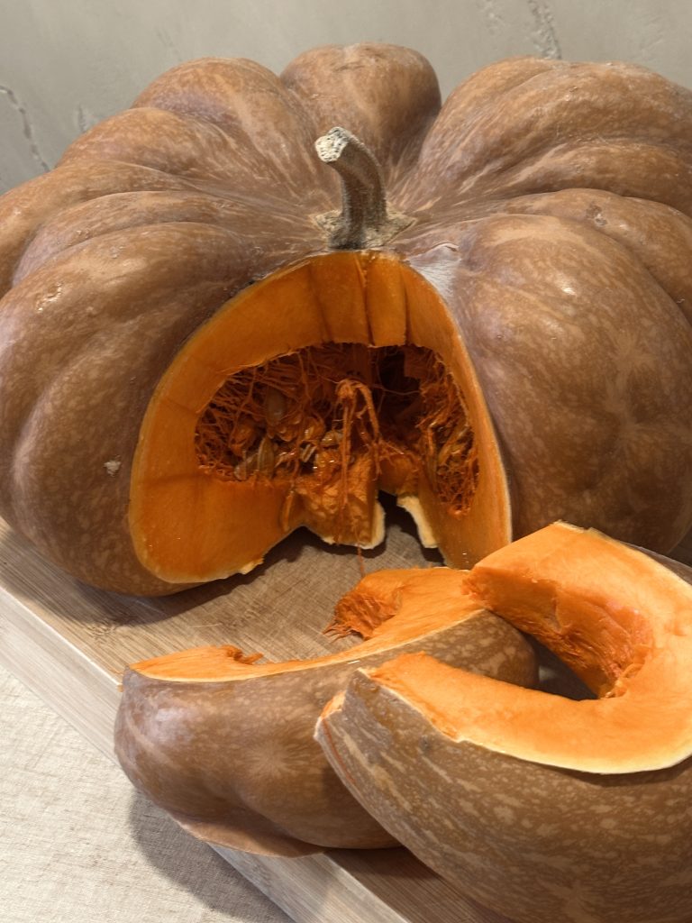 Alternative Text: A large, brownish pumpkin is partially sliced open to reveal its vibrant orange flesh and seeds inside.
