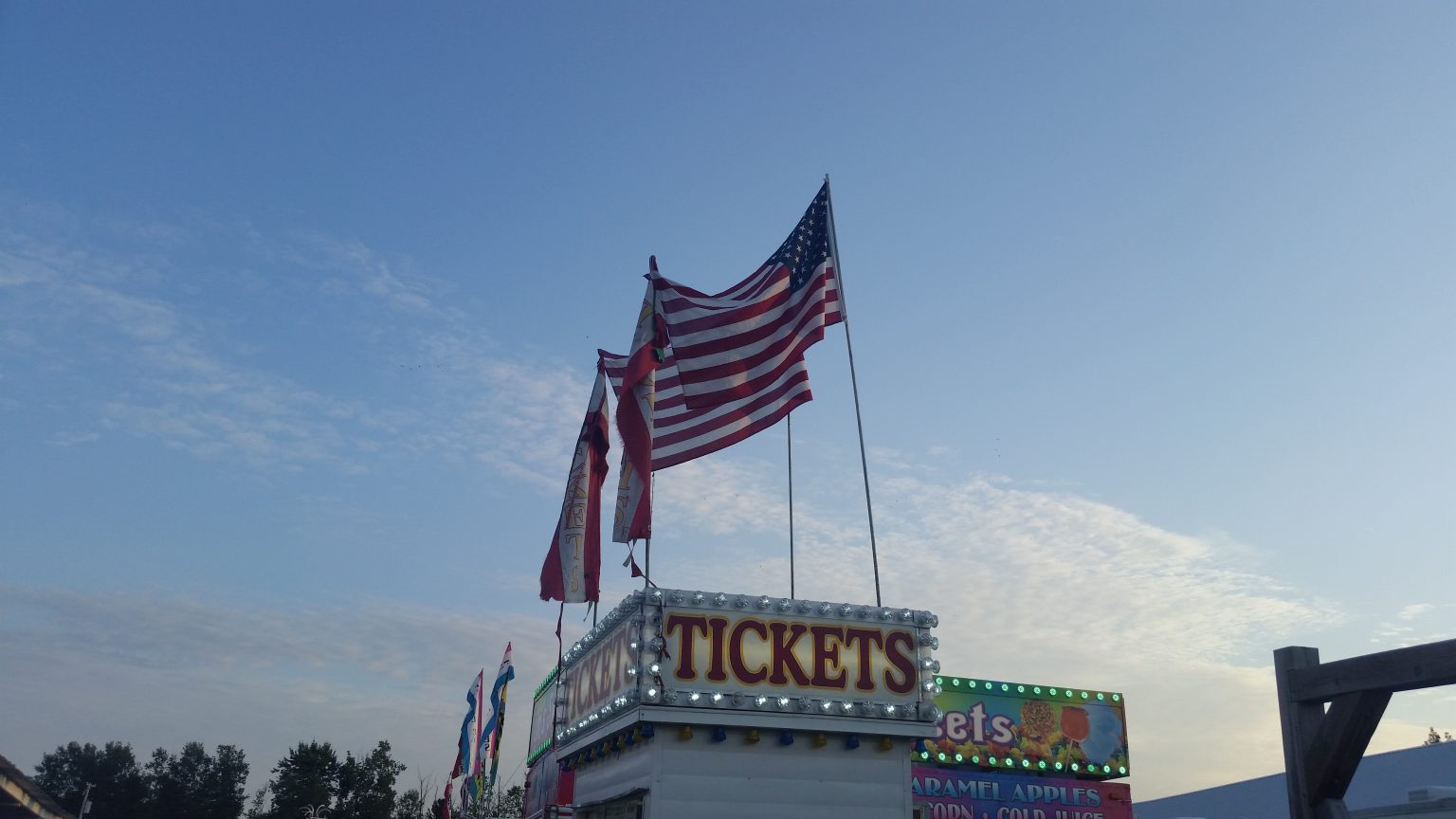 Alternative Text: Flags over a conession stand, summer carnival