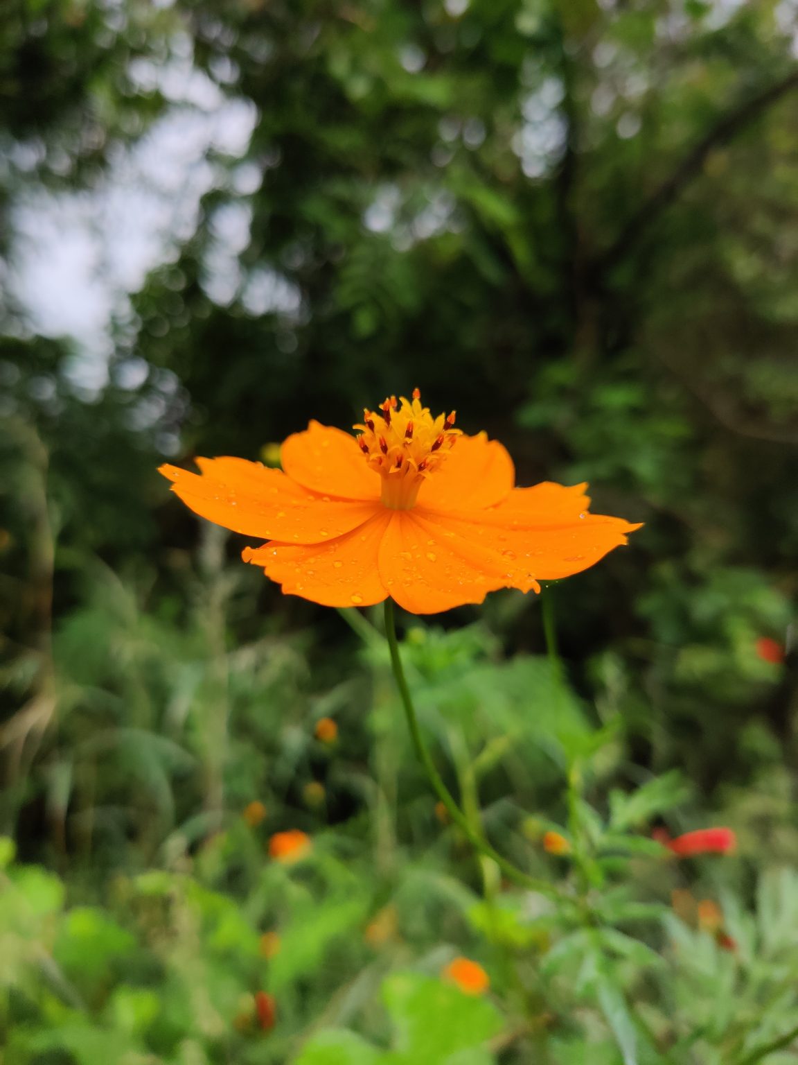 Alternative Text: A close-up of an orange flower with delicate petals and water droplets, set against a blurred green background.