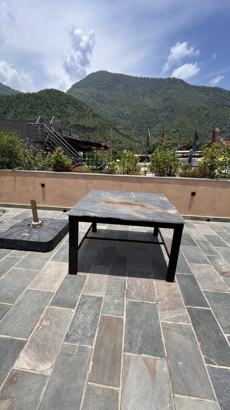 Alternative Text: A black stone table is positioned on a patterned stone patio under a partly cloudy sky. A clear view of green hills, flowers and flags on the background.