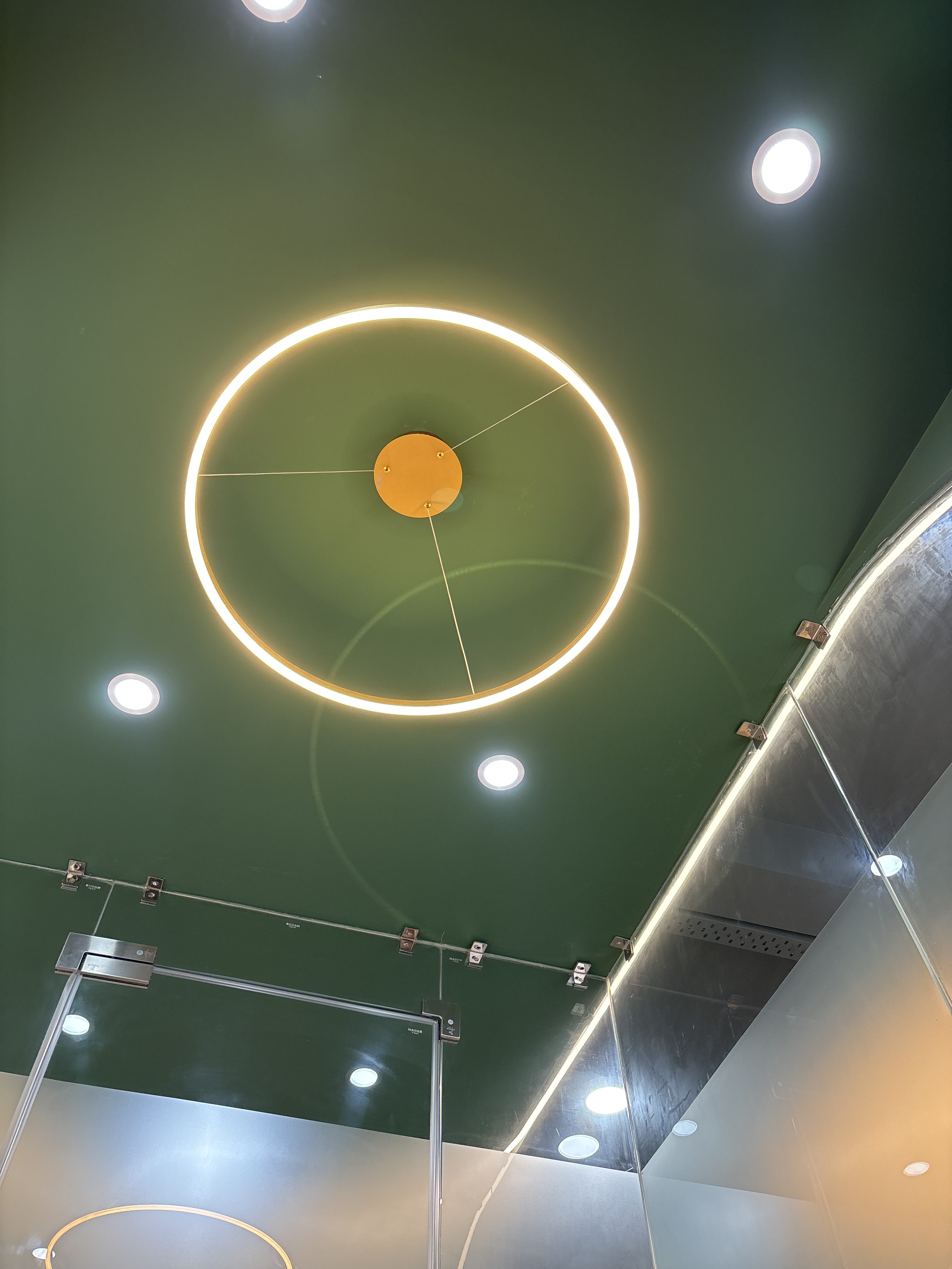 Alternative Text: The image shows a ceiling with a dark green surface, featuring a circular pendant light in the center, surrounded by multiple recessed lights.