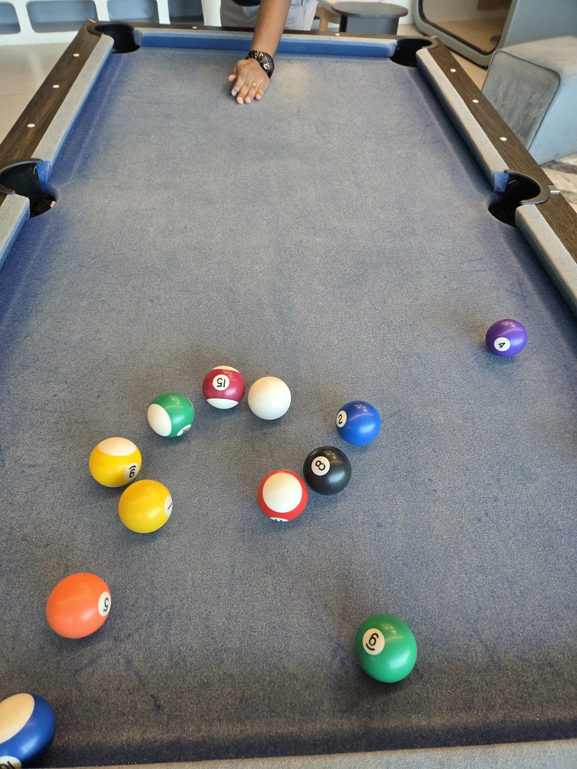 Alternative Text: A close-up of a billiards table with colorful pool balls on blue felt and a hand reaching in during play.