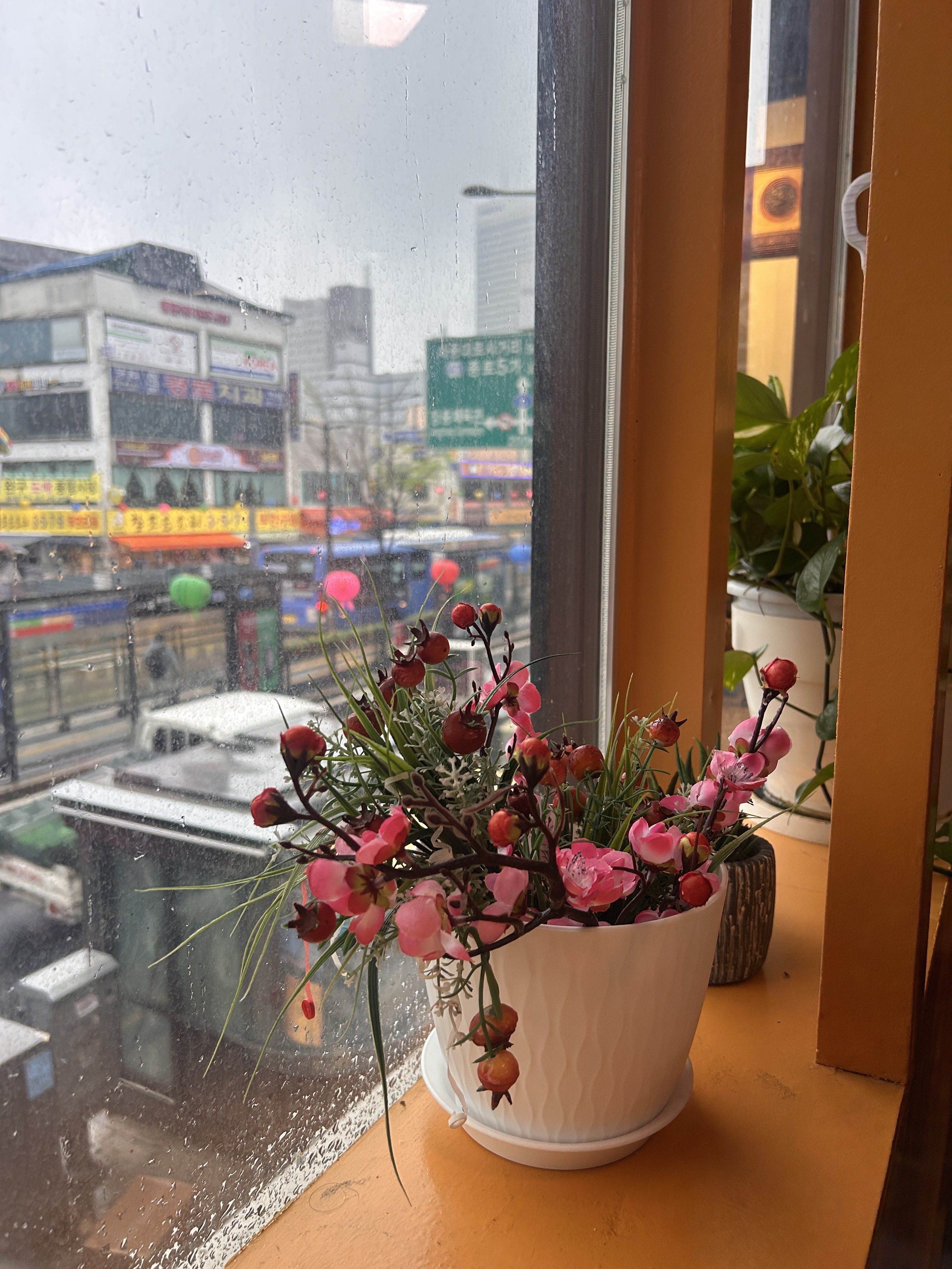 Alternative Text: A close-up of a decorative flower pot filled with artificial flowers sits on a windowsill.