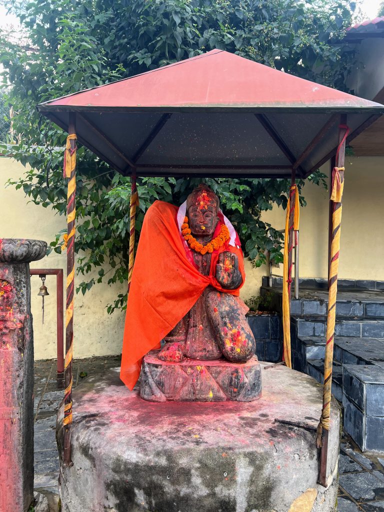 Alternative Text: The photo represents a statue of the Hindu deity Hanuman. The statue is covered in an orange cloth and smeared with red or orange powder, known as sindoor or vermillion.