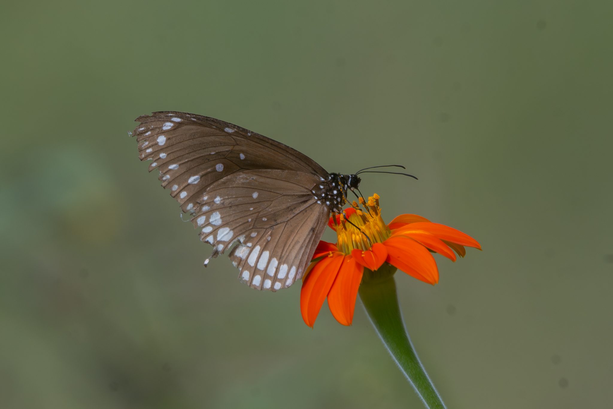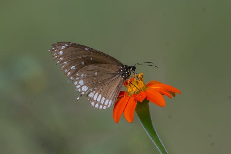 Alternative Text: Common Crow Butterfly with white spots on its wings is perched on a vibrant orange flower, drawing attention to its delicate features and colorful surroundings, with a softly blurred green background.