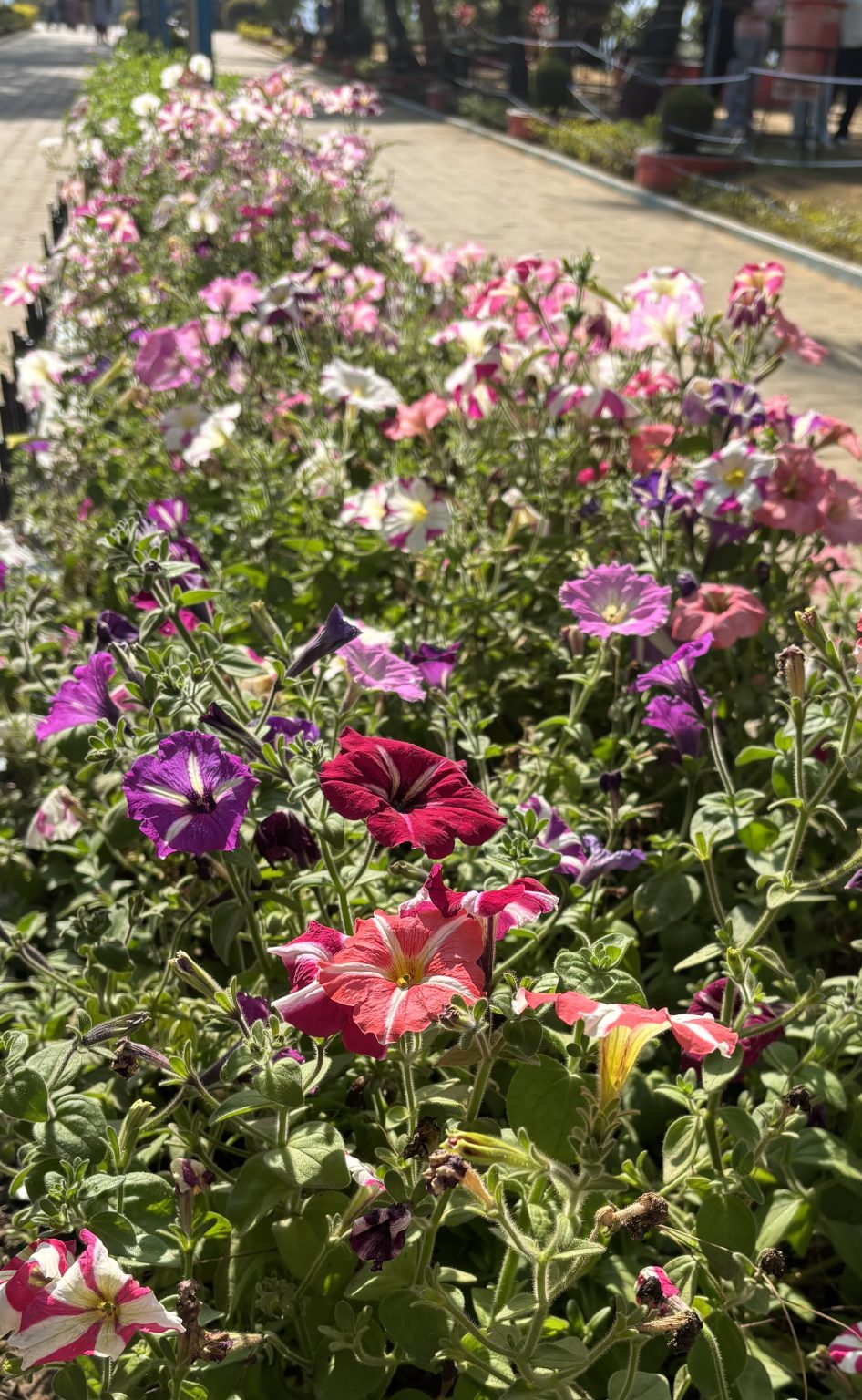 Alternative Text: A vibrant display of colorful petunia flowers, including shades of pink, purple, and red, fills the foreground.