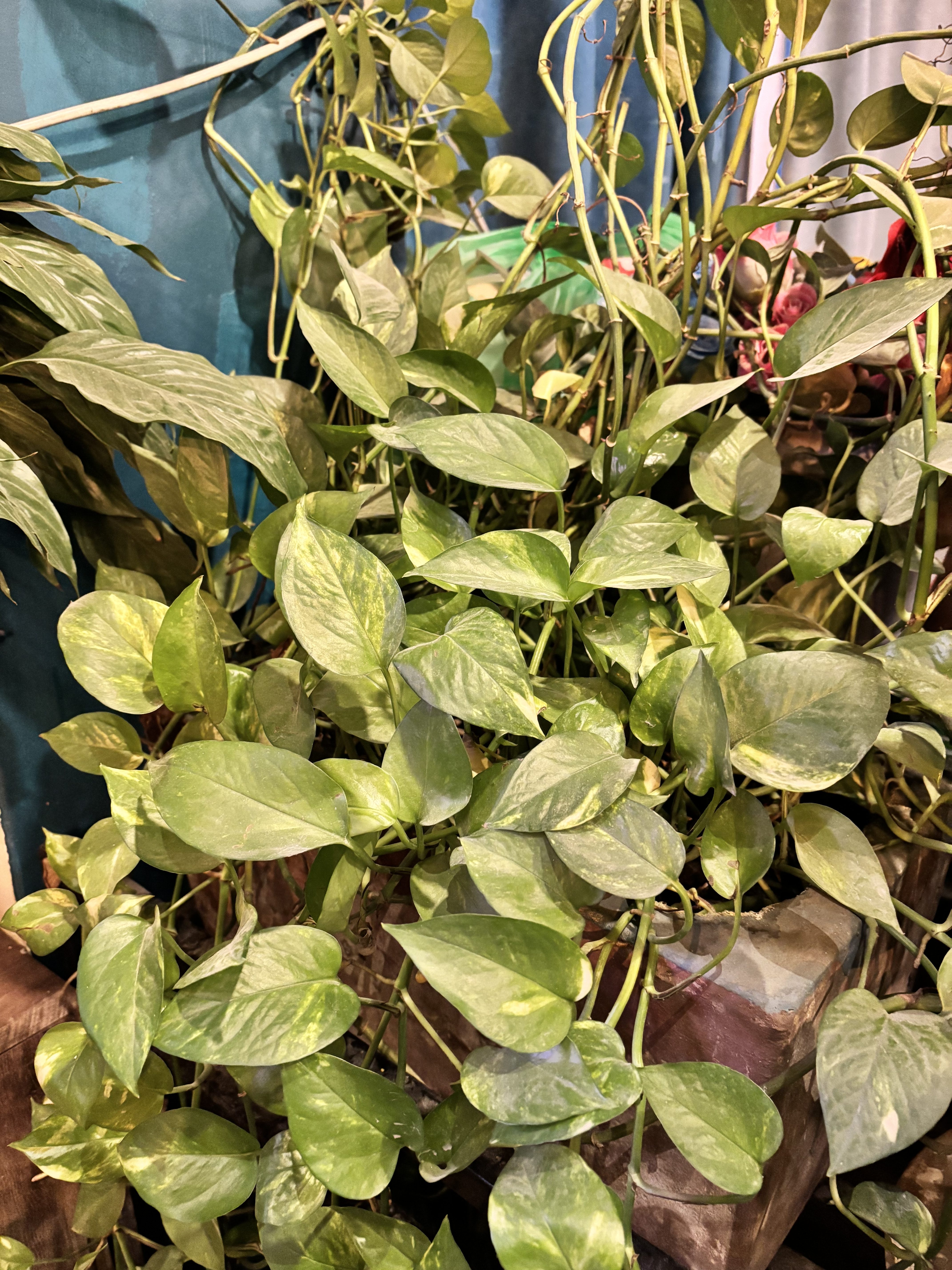 Alternative Text: A close-up view of lush green indoor plants, featuring vibrant heart-shaped leaves with varying shades of green.