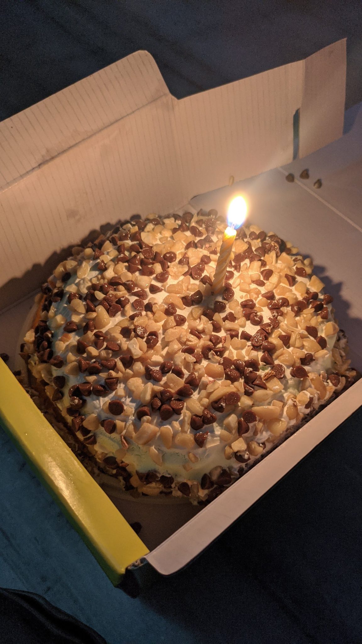 Alternative Text: A birthday cake with a lit candle in a box.