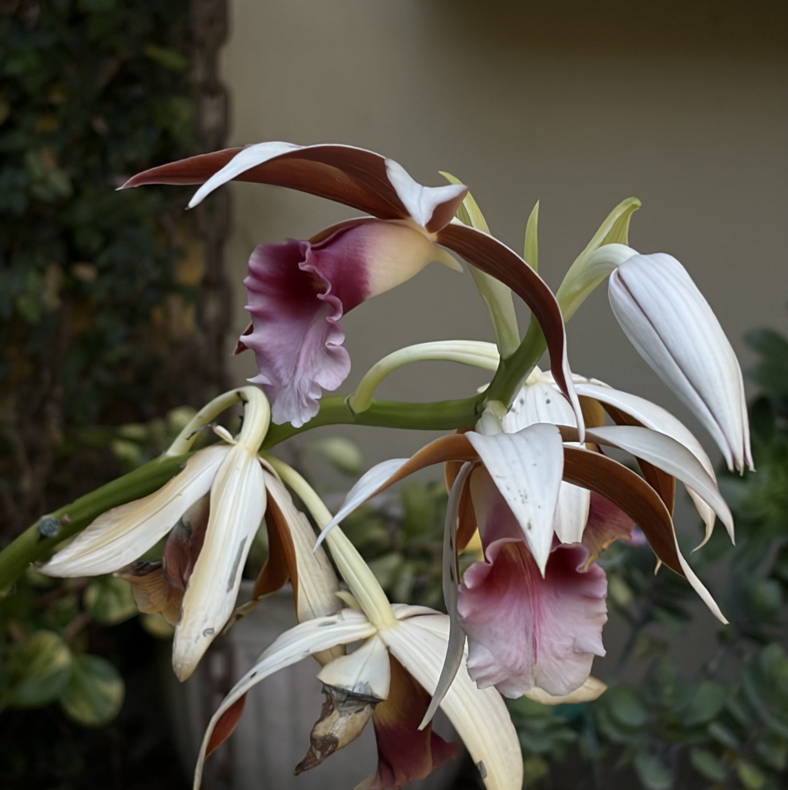 Alternative Text: A close-up of a Nun Orchid with white petals, brownish-red centers, a pink ruffled lip, and unopened buds against a blurred background.