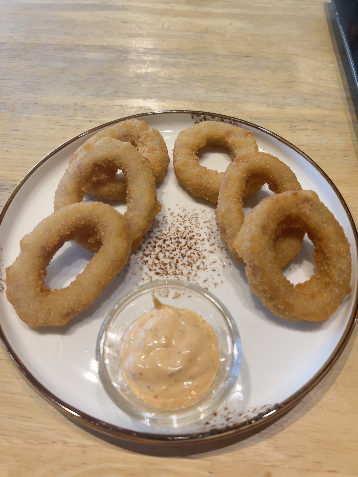 Alternative Text: A plate of onion rings with a side of dipping sauce.