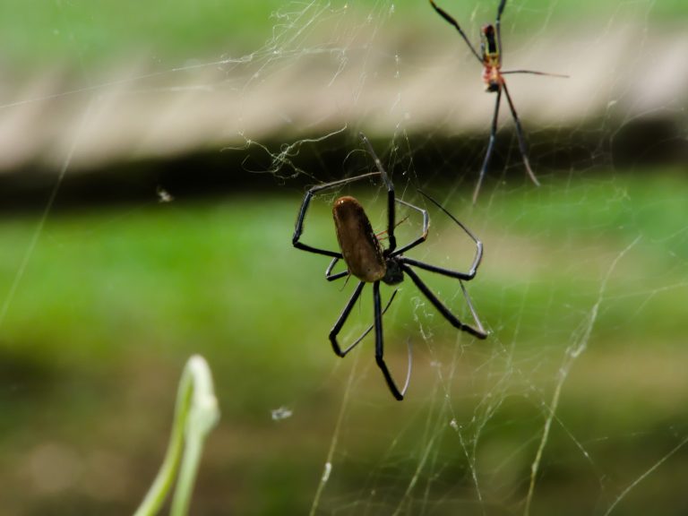 Alternative Text: A close-up of two spiders on a web in Uganda, with a large one in front and a smaller one above against a blurred green background.