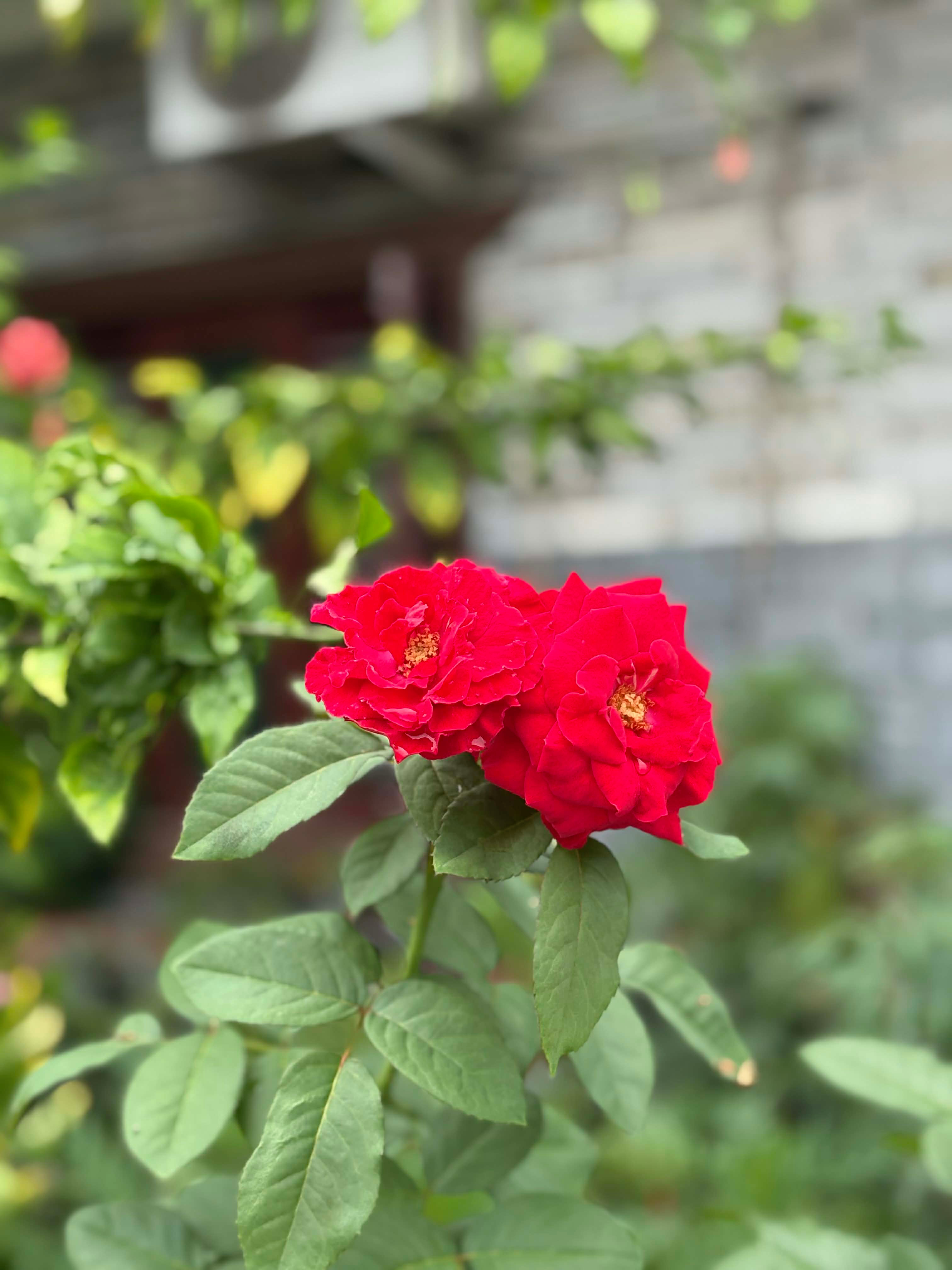 Alternative Text: A close-up view of vibrant red roses blooming on a green stem, surrounded by lush green leaves.