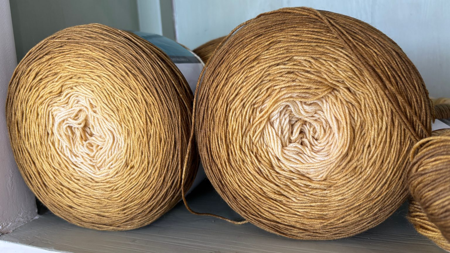 Alternative Text: Closeup of two rolls of yarn sitting on a shelf.