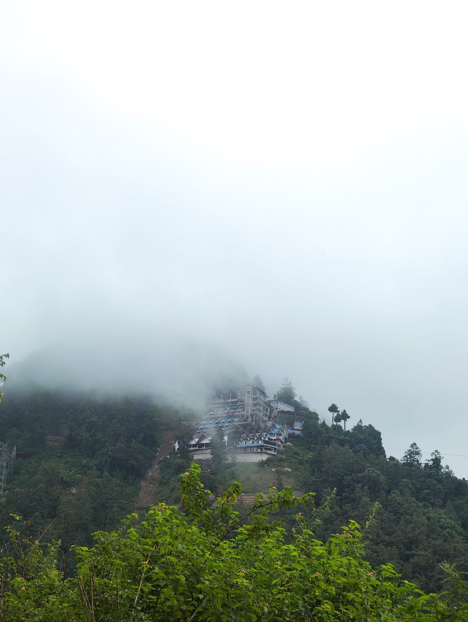 Alternative Text: A misty mountain landscape featuring a partially obscured building complex situated on a slope.