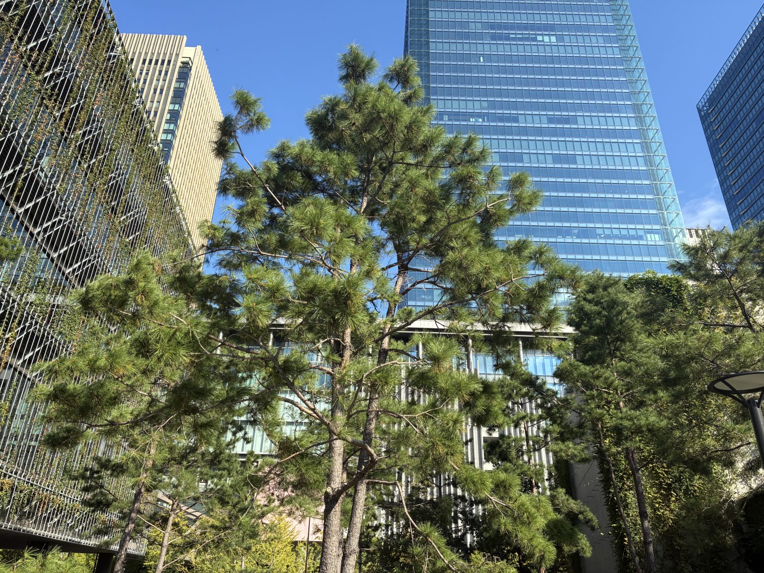 Alternative Text: A tall conifer tree in front of modern glass buildings reflecting the blue sky in Osaka.