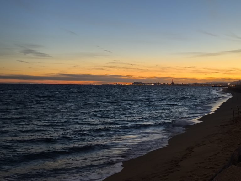 Alternative Text: A peaceful Barcelona beach at sunset with gentle waves.