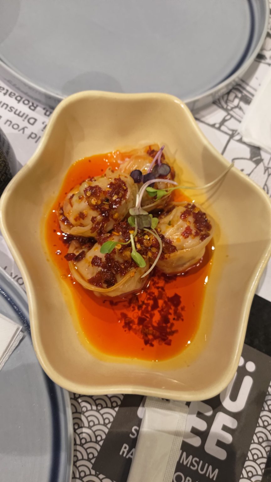 Alternative Text: Sichuan chili oil prawn wonton served in a bowl.